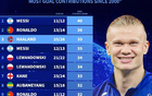 哈兰德本赛季至今直接参与35球,本世纪所有球员赛季同期第3 -